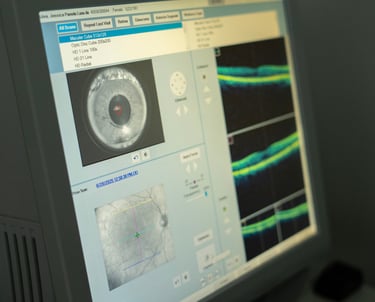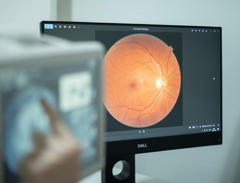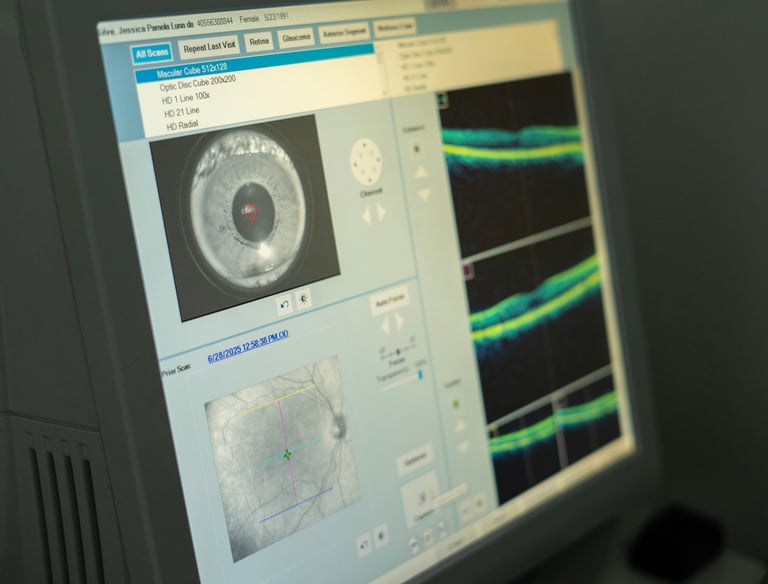Exame não invasivo que analisa, em alta resolução, as camadas da retina, mácula e nervo óptico. Fundamental no diagnóstico e acompanhamento de glaucoma, degeneração macular e retinopatia diabética.