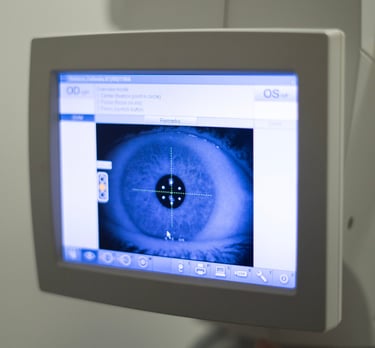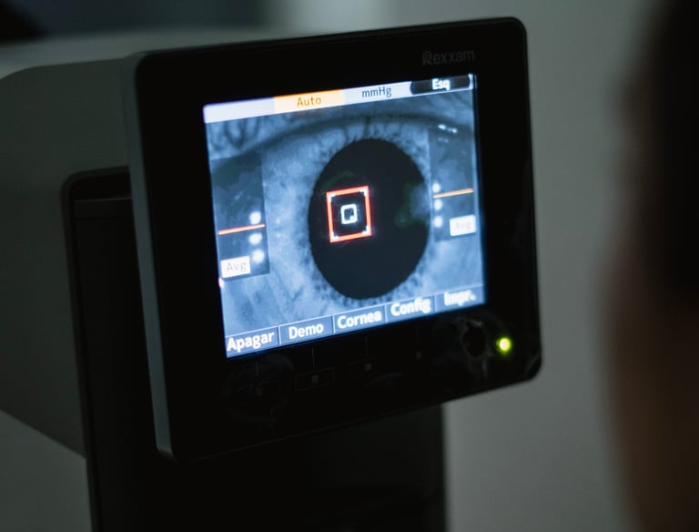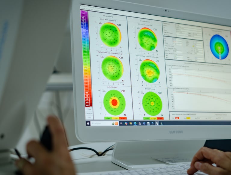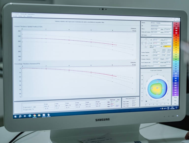 A ceratometria avalia a curvatura da córnea e a refração mede o grau dos olhos. Ambos são essenciais para prescrição de óculos, lentes de contato e planejamento cirúrgico.