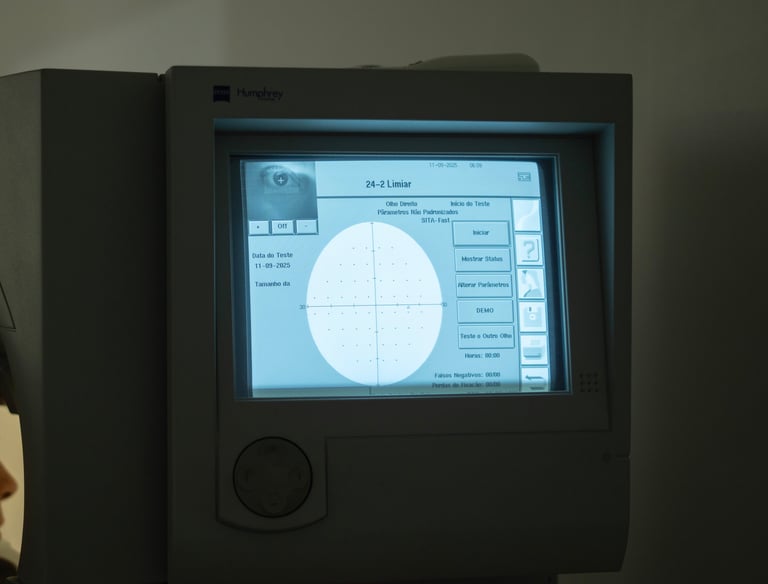 Avalia o campo visual, detectando alterações centrais e periféricas. É essencial no diagnóstico e controle do glaucoma e em doenças que afetam nervo óptico e vias visuais. E é importante também nas suspeitas de tumores e outras doenças neurológicas